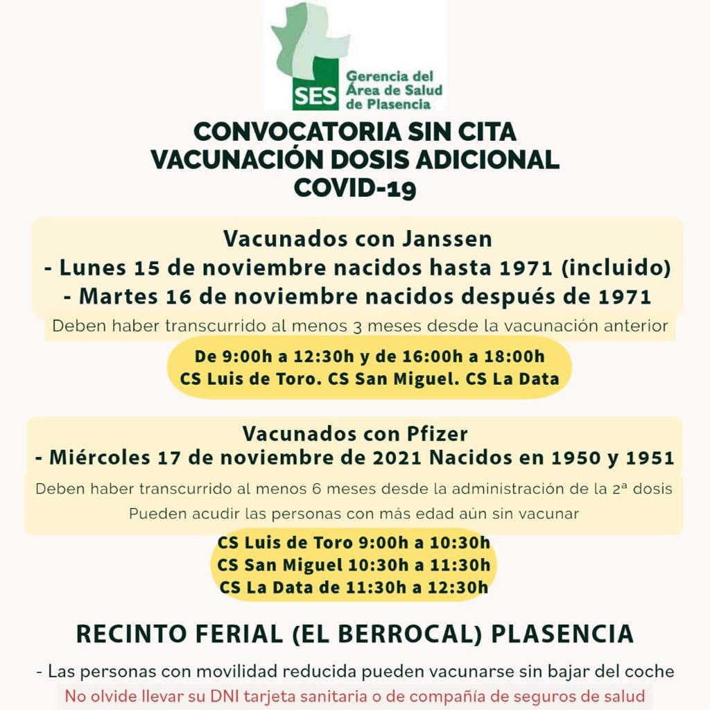 15, 16 y 17 de Noviembre - Convocatoria sin cita dosis adicional COVID-19
