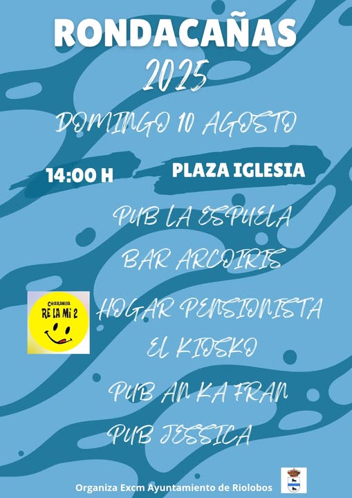 10 de Agosto - Rondacañas 08 agosto 2025 Domingo 10 de agosto. A partir de las 14:00 h. Plaza de la Iglesia. Disfrutaremos del mejor ambiente con la charanga Re La Mi 2 para hacer la ruta por los bares del pueblo.